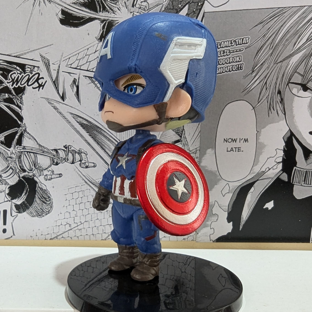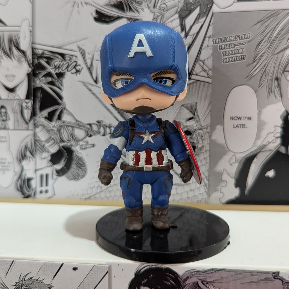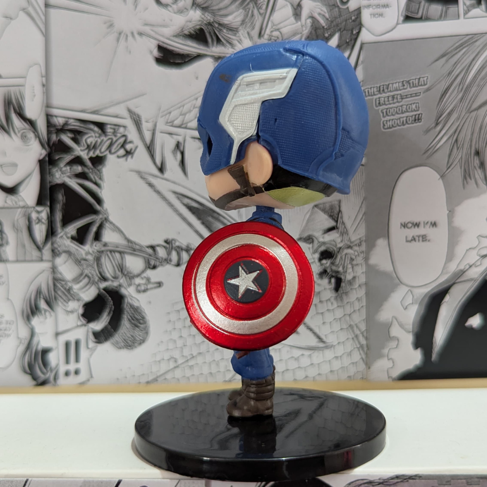 - Iconic Captain America Pose: Features Steve Rogers in his iconic suit, ready to defend with his legendary shield.