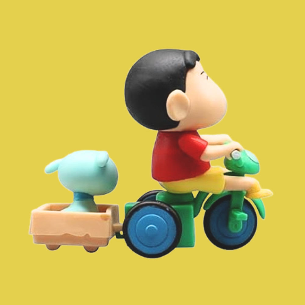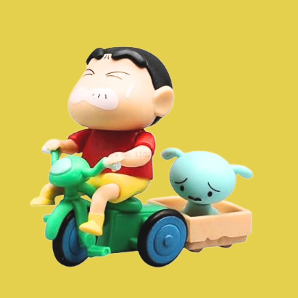 - Iconic Bicycle Pose: Features Shinchan riding his bicycle with shiro in the back, showcasing his playful and adventurous personality.