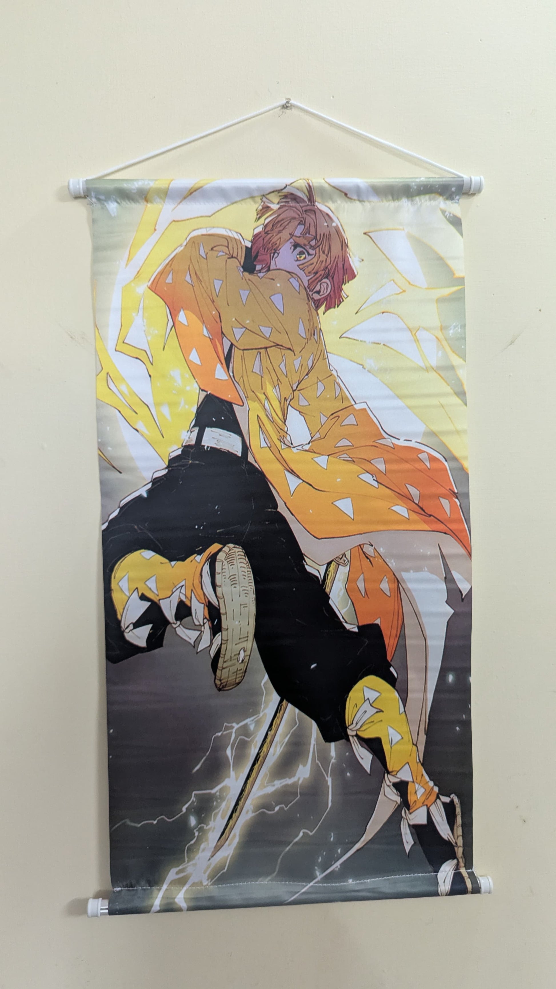 Featuring Zenitsu Agatsuma wielding his sword with electrifying intensity, this wall scroll captures the power and determination of his character with sharp details and bold colors. Perfect for anime-themed spaces, gaming setups, or as a standout gift, this wall scroll is a treasure for fans and collectors alike.